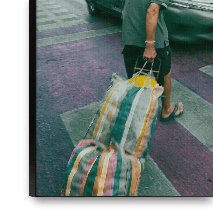 Cette image capture de manière saisissante l'énergie implacable d'une rue animée de Bangkok, en Thaïlande. Au milieu du flou des taxis qui passent et du flux constant de la circulation, un homme marche avec détermination dans le chaos, portant de lourds sacs et avançant d'un pas. Son mouvement déterminé à travers l'agitation de la ville…