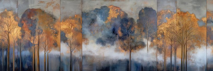Sur la toile, vous voyez de longs troncs d'arbres étroits qui s'élèvent comme des touches fines sur un piano, interrompus par des traînées de brume et un récif de feuilles chaudes. Les masses de feuilles ne sont pas travaillées de manière naturaliste ; elles sont constituées de couches brillantes d'or et de cuivre qui se fondent dans des tons bleus profonds et des lavis grisâtres. Dans le fond apparaît un reflet d'eau, vague et réfléchissant, d'où s'élèvent ici et là des traînées sombres qui suggèrent la profondeur. Techniquement, cela fonctionne comme un paysage abstrait : des lavis transparents, de larges coups de pinceau et une texture subtile donnent une impression granuleuse et organique, comme si les pierres, la mousse et la brume se touchaient. Le choix de couleurs chaudes et froides contrastées visait clairement à guider le regard : les taches orange-doré chaudes attirent le regard vers l'avant, tandis que les champs bleus et gris froids le repoussent vers l'arrière, créant ainsi une tension méditative qui fait de ce tableau une décoration murale puissante.