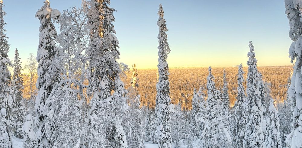 Photo d'un panorama d'un paysage enneigé avec beaucoup de neige sur les branches des arbres en Laponie finlandaise