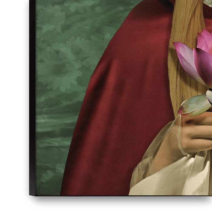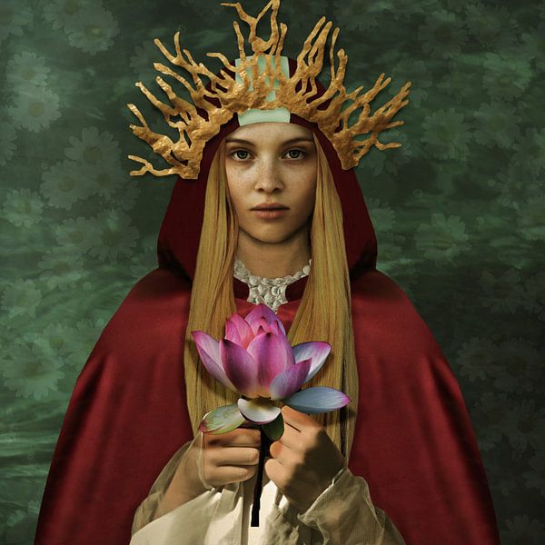 Vintage Beauty ressemble à un personnage de conte de fées avec sa cape rouge, dont la couleur contraste avec la couleur verdâtre du lac au loin. Sur sa tête, elle porte une couronne de corail doré, héritage de ses ancêtres, signe de sa lignée royale. Dans ses mains, le lys brille comme un joyau, symbole d'amour et d'espoir. De…