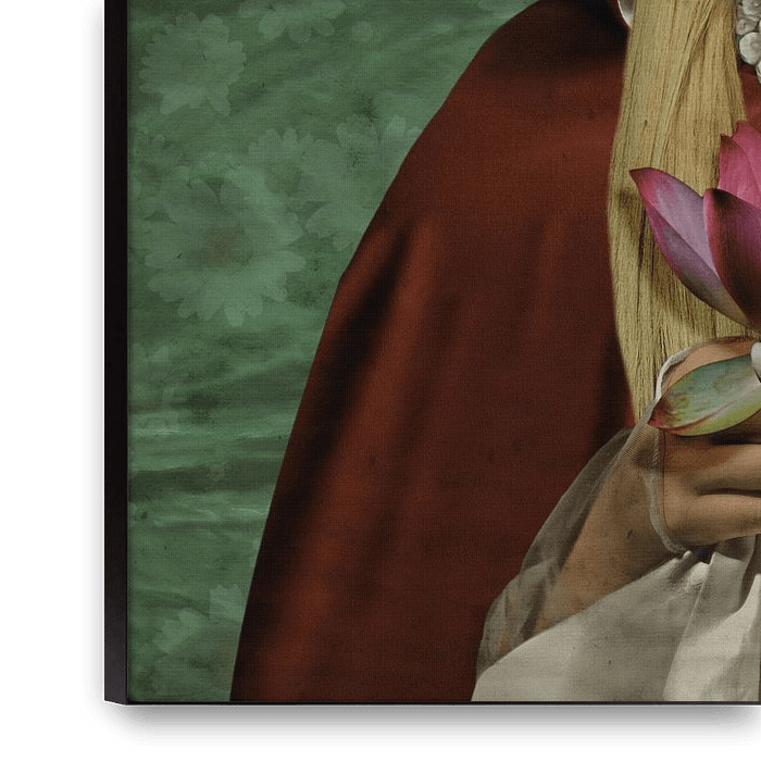 Vintage Beauty ressemble à un personnage de conte de fées avec sa cape rouge, dont la couleur contraste avec la couleur verdâtre du lac au loin. Sur sa tête, elle porte une couronne de corail doré, héritage de ses ancêtres, signe de sa lignée royale. Dans ses mains, le lys brille comme un joyau, symbole d'amour et d'espoir. De…