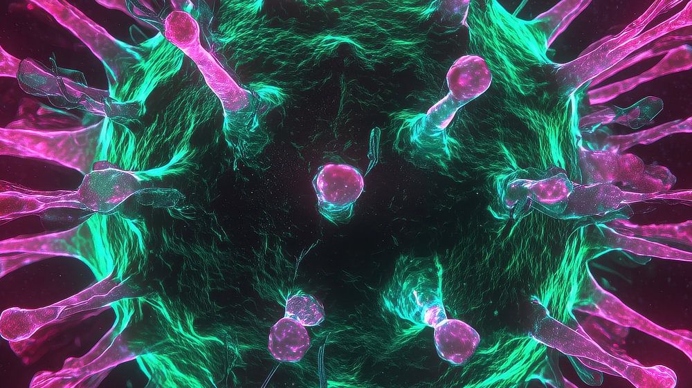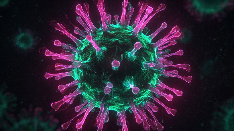 Le tableau rose-vert du coronavirus covid 19 est une décoration murale saisissante et contemporaine qui réunit la science et l'art d'une manière unique. Cette image puissante représente le coronavirus dans un style abstrait et néon, avec des roses et des verts intenses qui se détachent nettement sur un fond noir profond. Le résultat est…