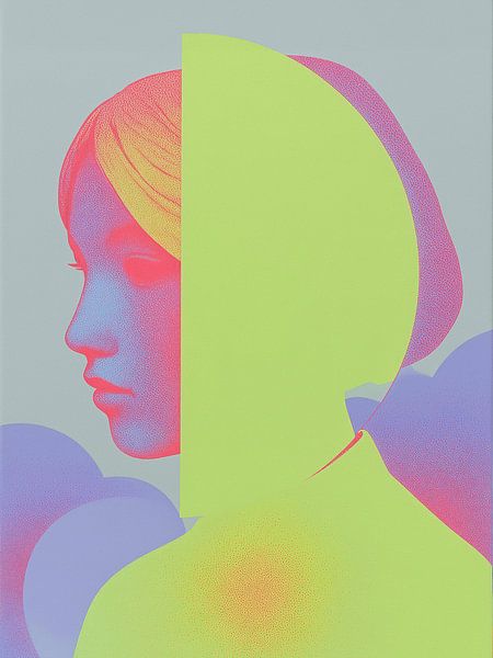 Kira est un portrait moderne et abstrait d'une jeune femme fusionnant des formes graphiques et des éléments floraux. Le visage émerge de grandes fleurs et de zones de couleurs fluides aux accents néon, combinées à des gris doux et des jaunes chauds. L'utilisation de la transparence, du chevauchement et des transitions de couleurs douces…