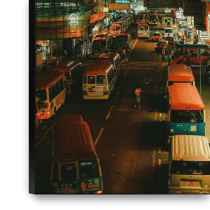 L'image capture l'atmosphère animée d'un carrefour de Hong Kong la nuit, marquée par les enseignes lumineuses au néon en caractères chinois et les minibus rouges distinctifs. La scène documente la vie nocturne trépidante d'une grande ville où le trafic, l'architecture et les couleurs se confondent. La rue est remplie de bus urbains, de…