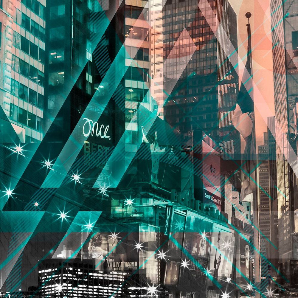 Une composition moderne et décorative avec des figures géométriques. On y voit deux vues typiques de la ville de New York. Une scène de rue de Times Square, très animé, ainsi que le pont de Brooklyn, magnifiquement éclairé, la nuit.