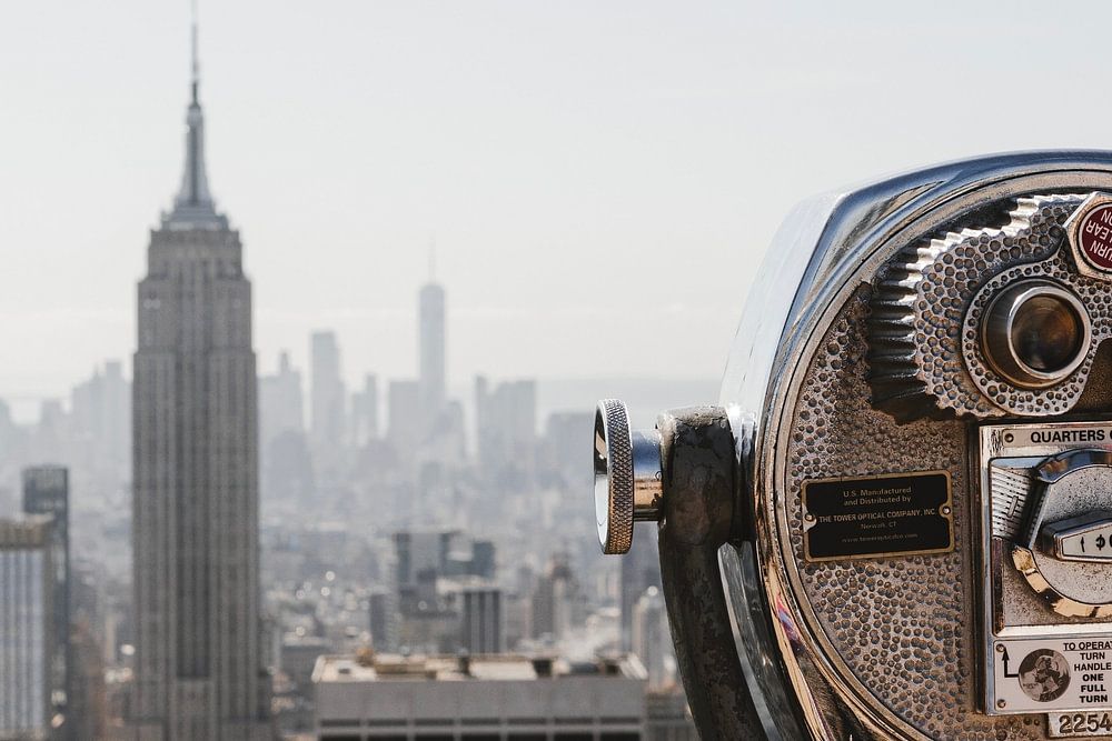 Vue de la ville de New York avec des jumelles depuis le sommet du rocher. Vue de l'Empire State Building.