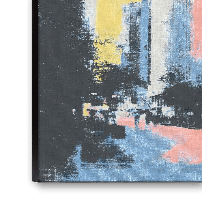 Close-up du grand hall du New York Stock Exchange, menant à Wall Street. Illustration de style risographe à plat avec des couleurs pastel douces, des lignes claires et de larges coups de pinceau. Composition minimaliste avec une palette de couleurs atténuées : ciel bleu, bâtiments roses et jaunes, ombres noires et rue grise. Parfait pour les amateurs d'art urbain, de minimalisme moderne et de décoration murale stylée qui apprécient le dynamisme, l'architecture et l'esthétique discrète des couleurs.