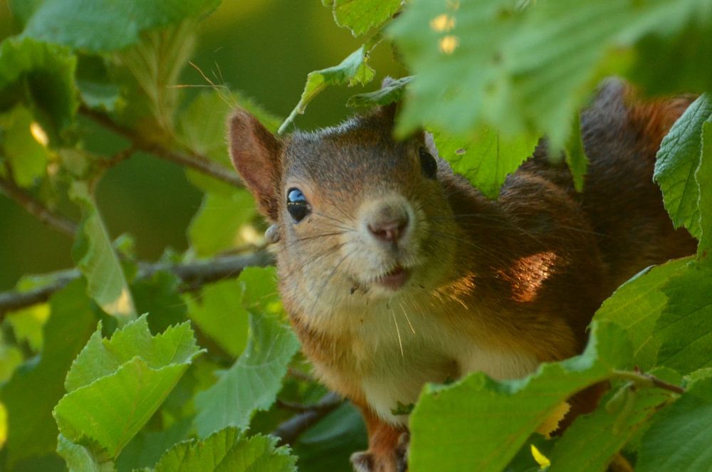 Deze eekhoorn kijkt stiekem mee vanuit de bosjes waar hij elke ochtend opzoek was naar lekkere nootjes om op te eten.