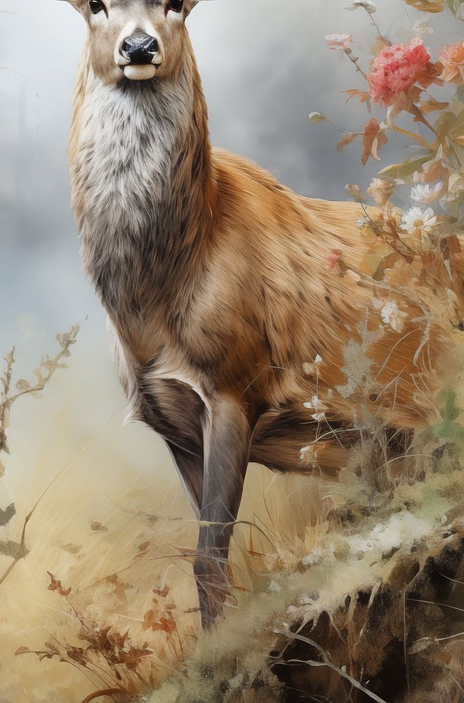 Un impressionnant cerf élaphe se tient en alerte parmi les couleurs de l'automne, ses puissants bois fièrement dressés. L'arrière-plan brumeux et les fleurs subtiles à côté du tronc confèrent à la scène une tranquillité presque féerique. Une œuvre d'art qui allie puissance et sérénité et qui s'intègre parfaitement dans les intérieurs modernes et classiques.