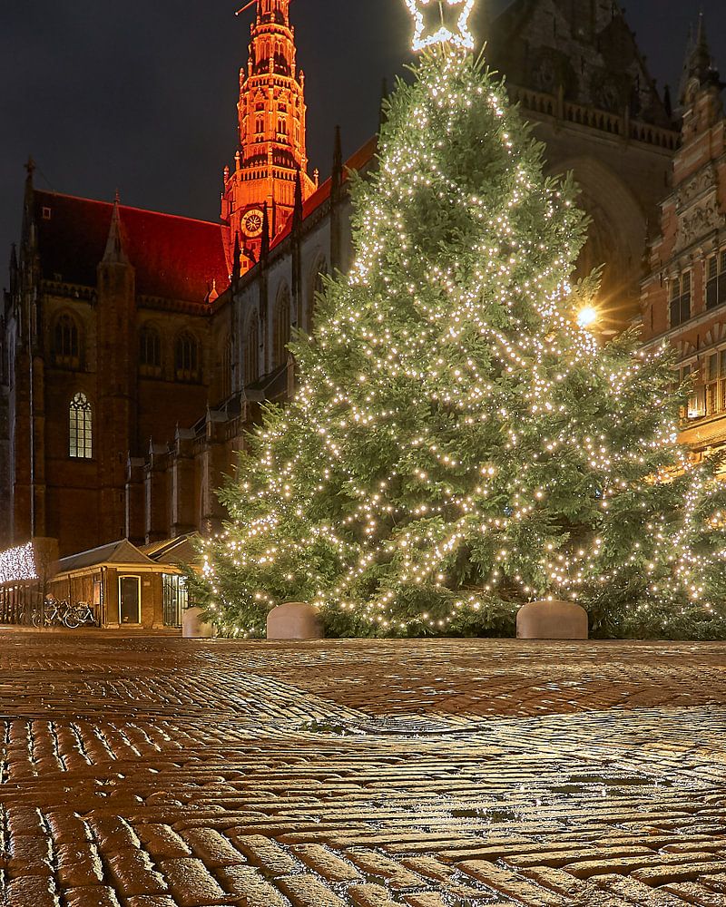 Le grand sapin de Noël traditionnel sur la Grand Place de Haarlem. À l'arrière-plan, la tour de la Grote Kerk est illuminée en orange, à l'occasion de la célébration de "Orange the World".