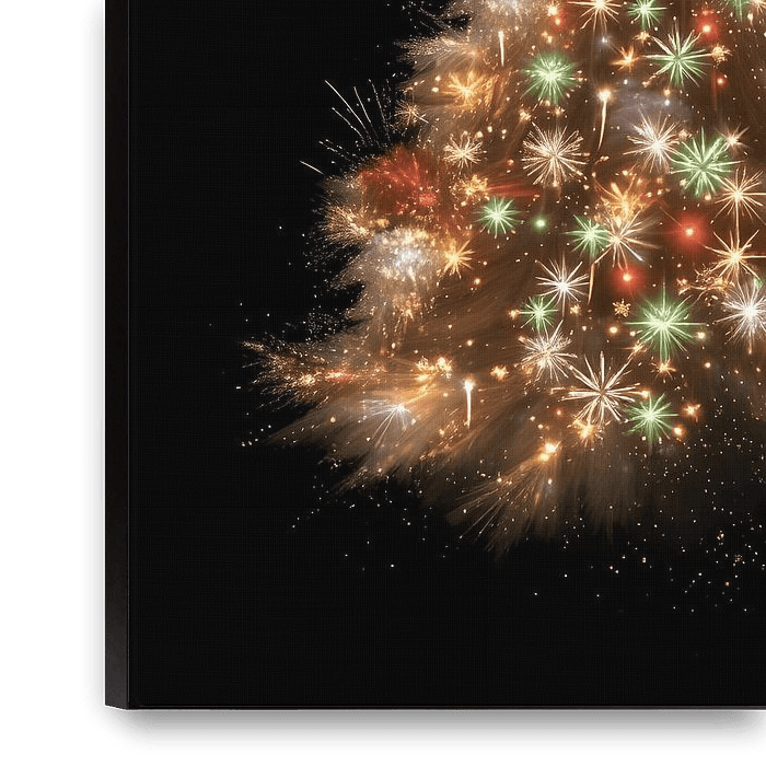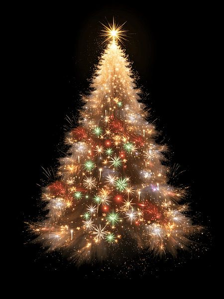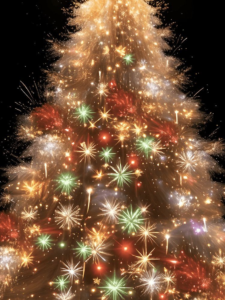 Cette œuvre d'art impressionnante représente un arbre de Noël composé de lumières scintillantes et de feux d'artifice étincelants, tout en capturant le moment spécial où Noël et le Nouvel An se rencontrent. Sur un fond noir profond, l'arbre s'élève comme un…