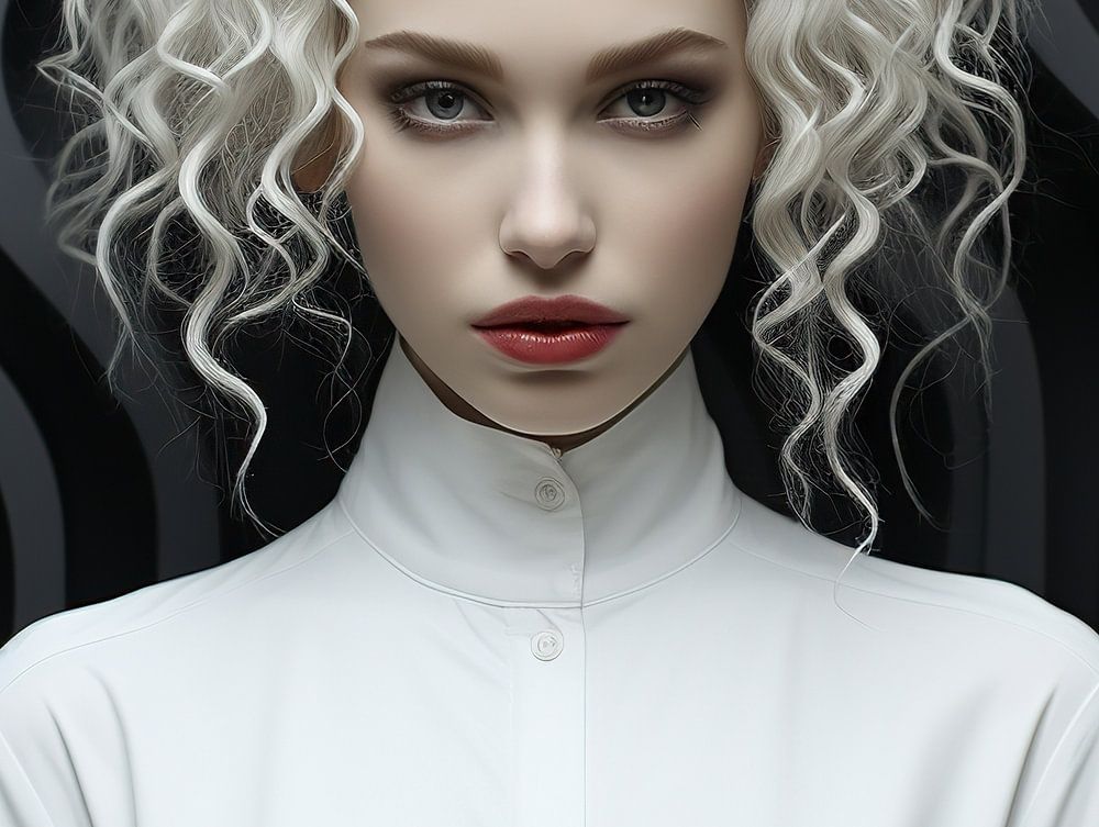 Une photographie montre un mannequin vêtu d'un vêtement blanc moulant. Ses mèches blondes claires contrastent avec un fond noir aux formes minimalistes. Le contraste souligne sa beauté sereine au milieu de lignes sobres et puissantes.