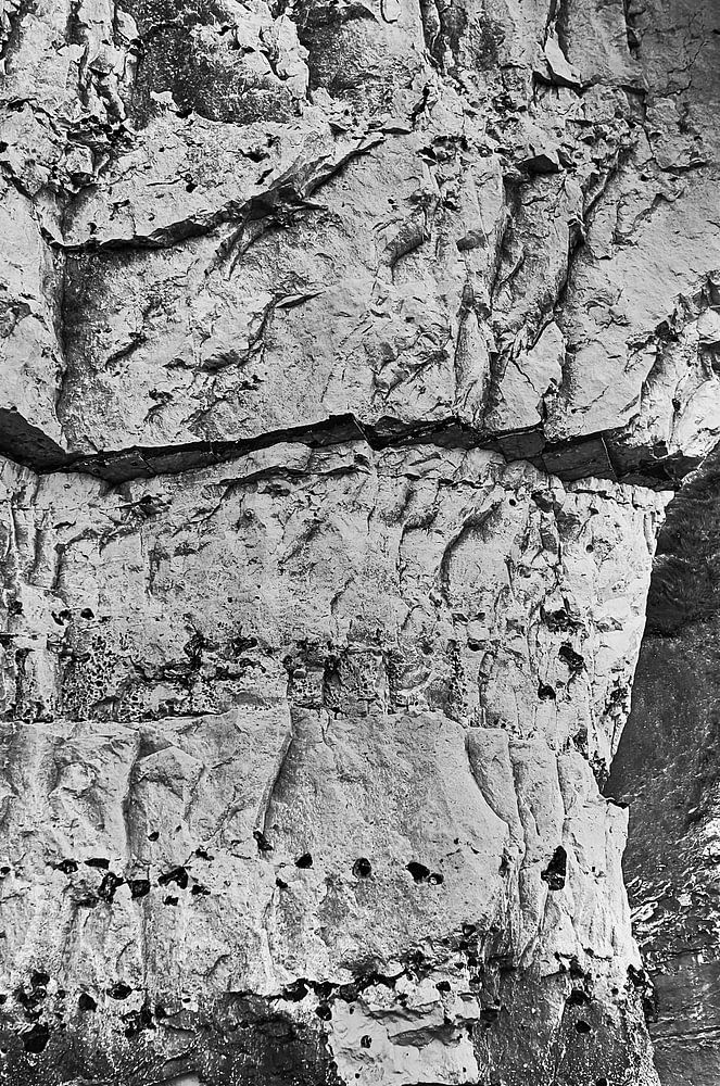 Photographie en noir et blanc de la Normandie en hiver. Large vue sur la mer et les rochers. Soleil bas