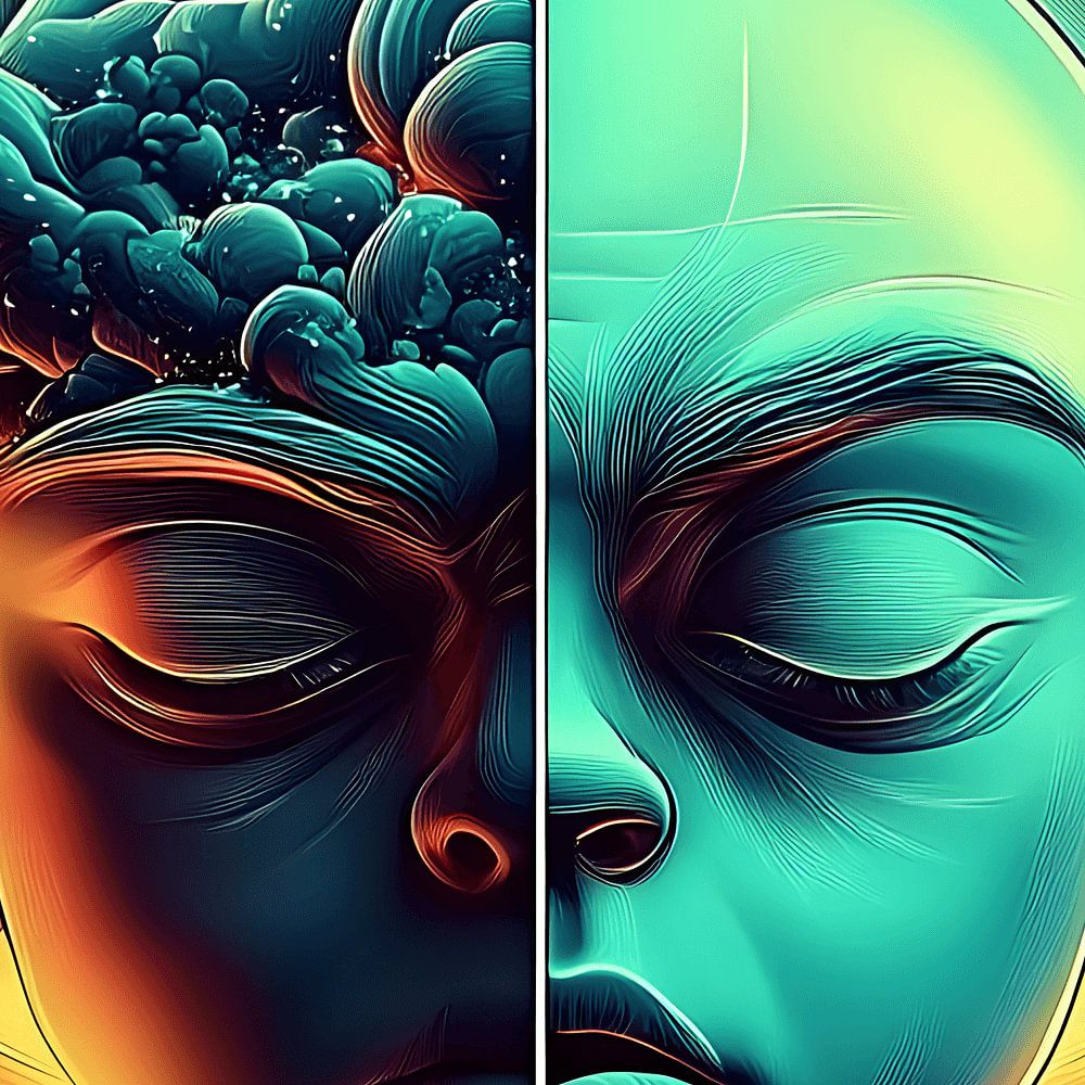 Une moitié du visage s'épanouit avec des tempêtes cosmiques et des nuages neuronaux qui représentent l'imagination sans limite du rêveur éveillé. L'autre côté repose dans un silence parfait, illuminé par la sérénité froide du vide. Derrière eux, l'univers brûle et respire - un rappel céleste que même dans l'obscurité, la lumière prend forme.
