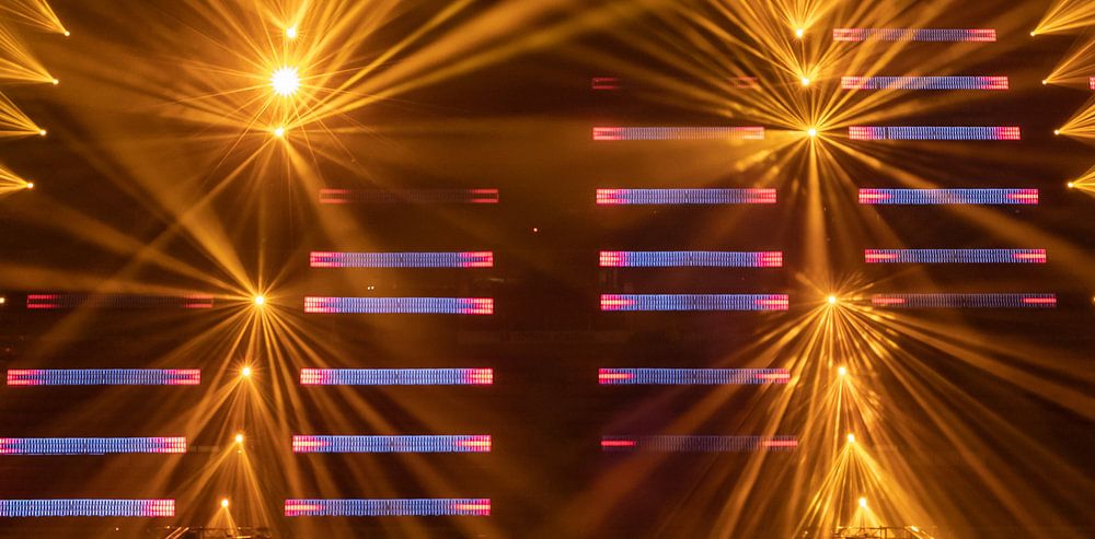Spectacle d'éclairage Noviter au Philips Stadium pendant Glow 2019. Ce spectacle coloré avec des faisceaux lumineux et des lasers peut devenir un souvenir durable sur le mur.