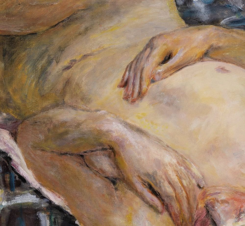 Une femme est exposée comme modèle sur ce portrait, un modèle nu sur un portrait nu. Son corps est largement visible, des cuisses aux hanches, en passant par le torse et un sein.