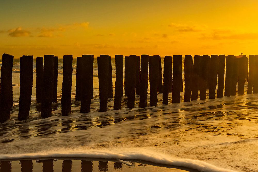 A propos de "Nuages hollandais et brise-lames typiques de poteaux en bois le long de la côte zélandaise"