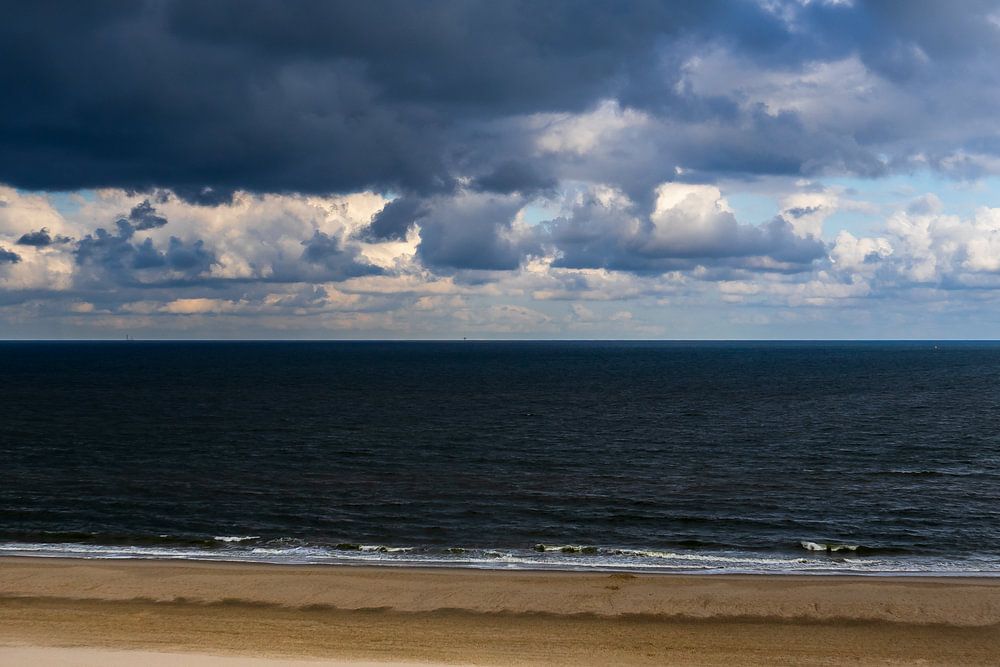 Nuages noirs au-dessus de la plage de Petten by the sea. Les nuages fournissent l'ombre qui crée un joli contraste entre la lumière et l'obscurité dans la photo.