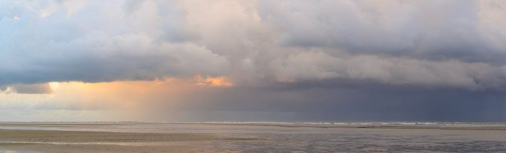 Nuages au coucher du soleil sur la plage de l'île de Texel, dans la région de la mer des Wadden, au nord des Pays-Bas, lors d'un après-midi d'automne orageux.