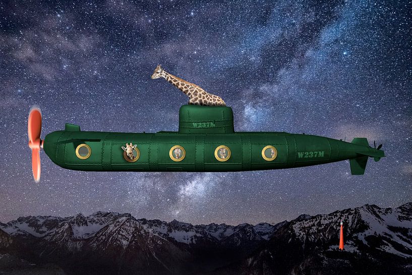 Rejoignez Giraffe dans son superbe hydravion pour une quête nocturne à la recherche de nouvelles aventures dans le collage « Starry Night ».