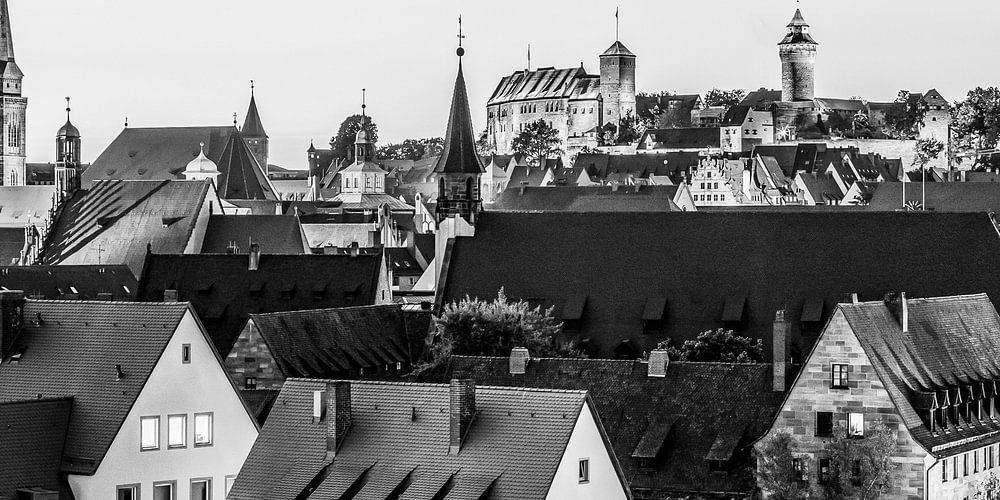 Photographie noir et blanc Vue de la ville de Nuremberg avec le château impérial et la vieille ville de Sebald avec l'église St. Sebald et la tour de la dette au crépuscule, Franconie, Bavière, Allemagne