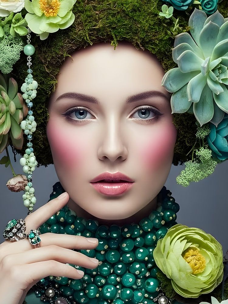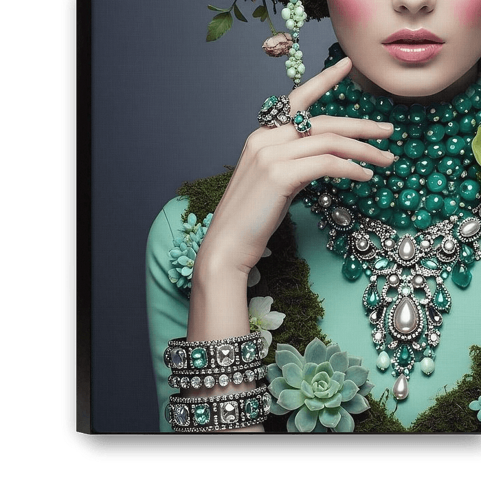 Elle porte un collier exquis, composé de plusieurs couches de perles vertes et d'éléments argentés scintillants, agrémenté de perles et de motifs complexes, qui s'harmonise avec sa tenue vert menthe. Sa main, ornée de bracelets et de bagues étincelants ornés de pierres précieuses vertes, touche gracieusement son menton. Son visage est artistiquement maquillé avec des joues et des lèvres rose tendre, et ses yeux regardent directement, créant un effet enchanteur et hypnotique. Les riches textures des éléments naturels contrastent magnifiquement avec ses traits raffinés, le tout sur un fond sombre et morose qui met en valeur sa présence radieuse.