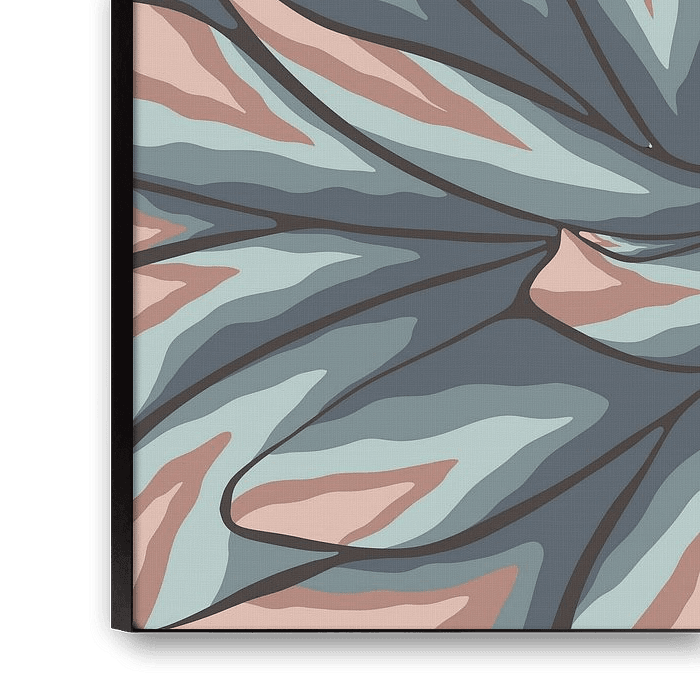 Cette œuvre d'art s'inspire du désert et de différentes plantes. Basé sur les feuilles d'une plante succulente et d'un cactus. Disponible en plusieurs couleurs. Cette version se compose de feuilles bleues et roses sur un fond gris foncé.