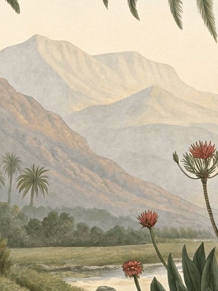 Cette œuvre d'art représente une oasis sereine du désert à l'aube, caractérisée par une lumière douce et éthérée illuminant des palmiers imposants et une flore luxuriante et variée le long d'une rivière sinueuse. À l'arrière-plan, des montagnes brumeuses s'éloignent, suggérant un paysage vaste et tranquille. Le premier plan est riche en textures végétales variées, des frondes pointues des plantes grasses aux pétales délicats des fleurs épanouies, tandis que les pierres lisses de la rivière évoquent un courant doux. L'ambiance générale est celle d'une solitude paisible et d'une beauté naturelle, rappelant les illustrations botaniques classiques avec une touche de romantisme.