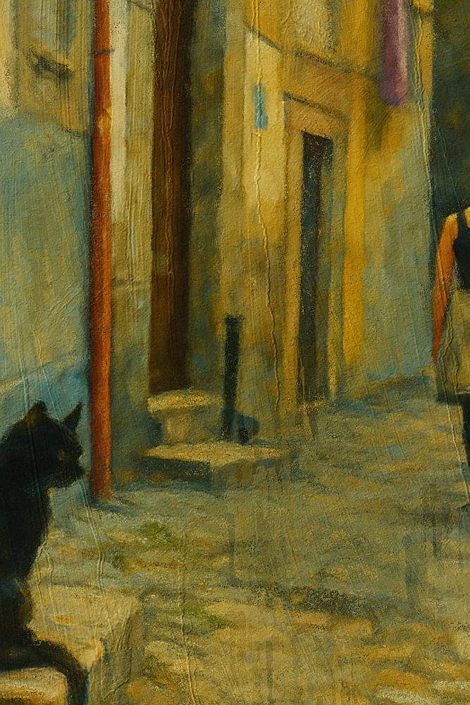 Une femme marche dans la ruelle tranquille, suivie par le regard curieux d'un chat noir qui l'observe dans l'ombre. La scène capture la magie d'une rencontre simple et quotidienne dans un cadre intemporel.