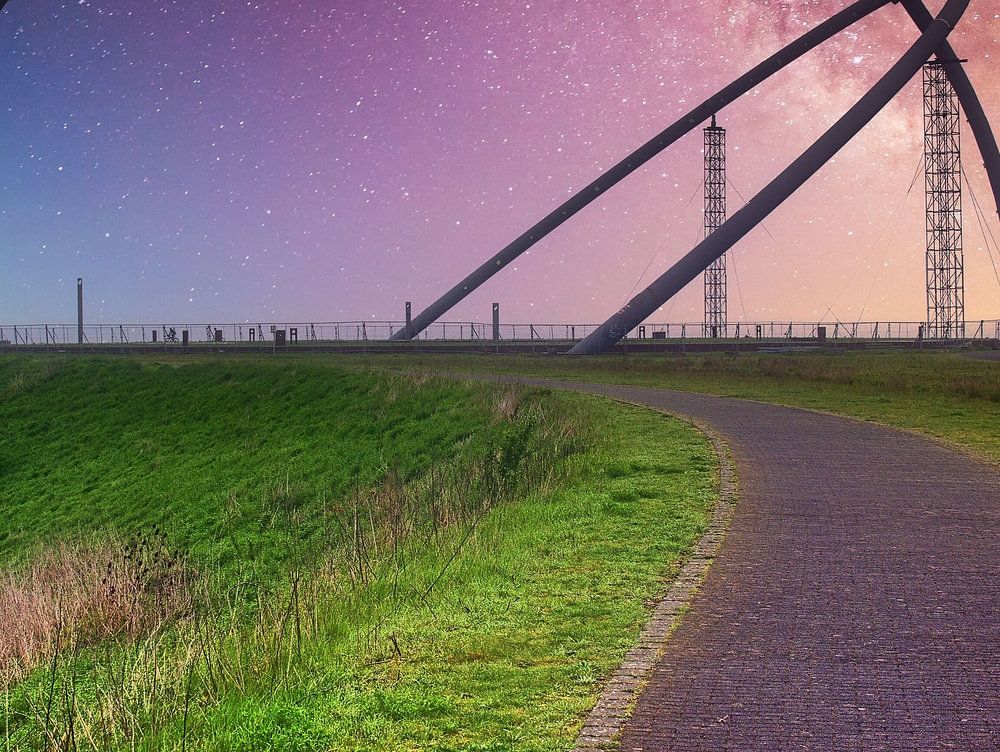 Photomontage d'une voie lactée avec l'observatoire céleste du terril Hoheward à Herten