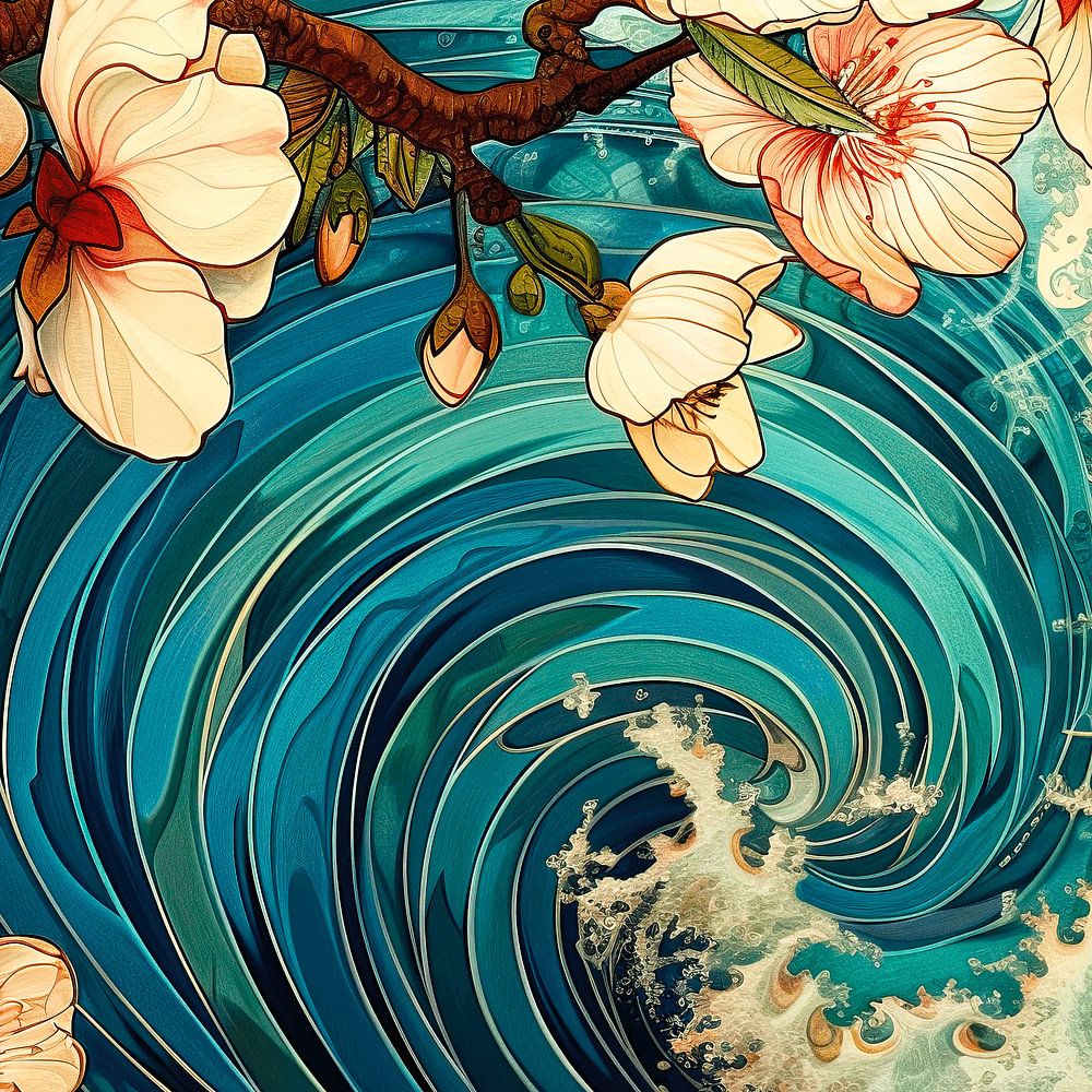 Une belle composition dans laquelle les fleurs de cerisier dansent sur les vagues d'un océan vibrant. La combinaison des fleurs et de l'eau crée une image dynamique.