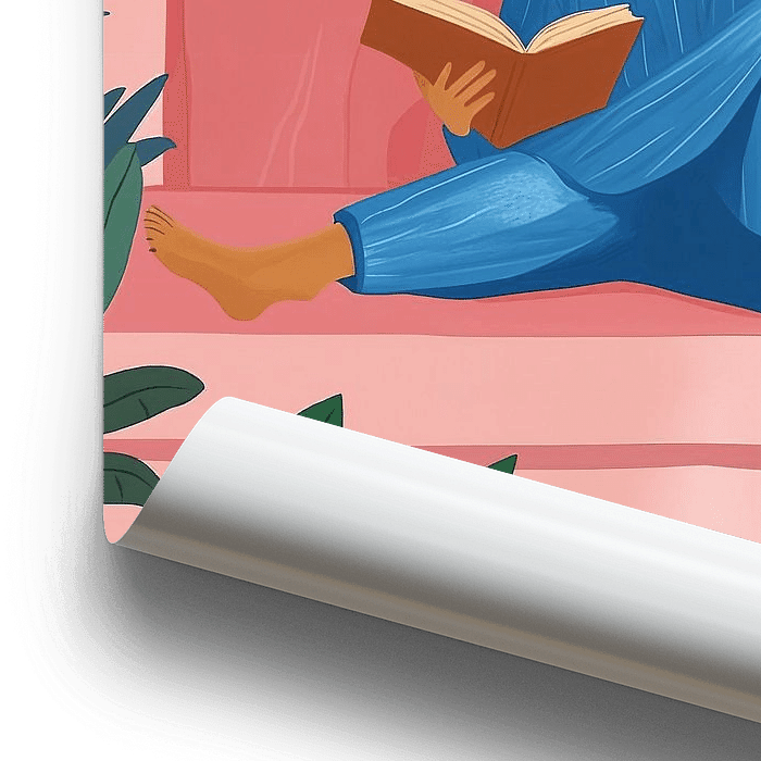 Dans cette œuvre d’art colorée, nous trouvons une scène sereine de soins personnels et de détente. Une femme en tenue bleue est assise confortablement sur un canapé rose, absorbée par son livre. Elle est entourée de plantes tropicales luxuriantes, créant un sentiment de tranquillité et de beauté naturelle. Les couleurs chaudes du fond…