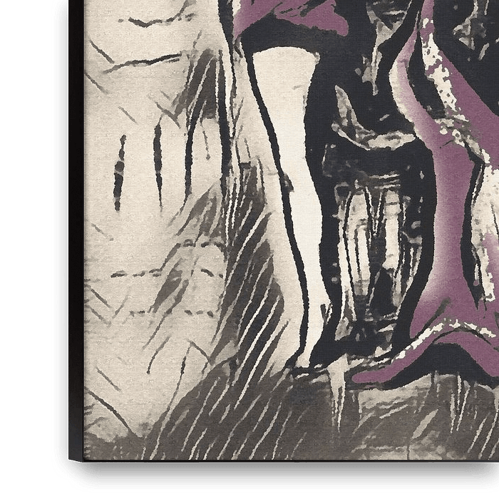 Œuvre abstraite d'une femme tenant une toile. L'œuvre est une adaptation numérique d'un dessin au fusain. Cette œuvre abstraite est réalisée dans les tons beige, noir violet et orange marron.