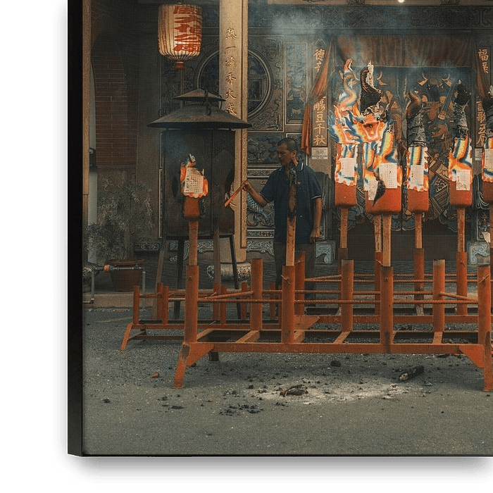 Cette photo fascinante capture l'atmosphère spirituelle d'un temple chinois traditionnel. Au centre, des offrandes enflammées sont placées devant la façade richement décorée du temple. Les volutes de fumée qui s'élèvent et la douce lumière confèrent à la scène un aspect méditatif, presque mystique. En arrière-plan, on distingue les…