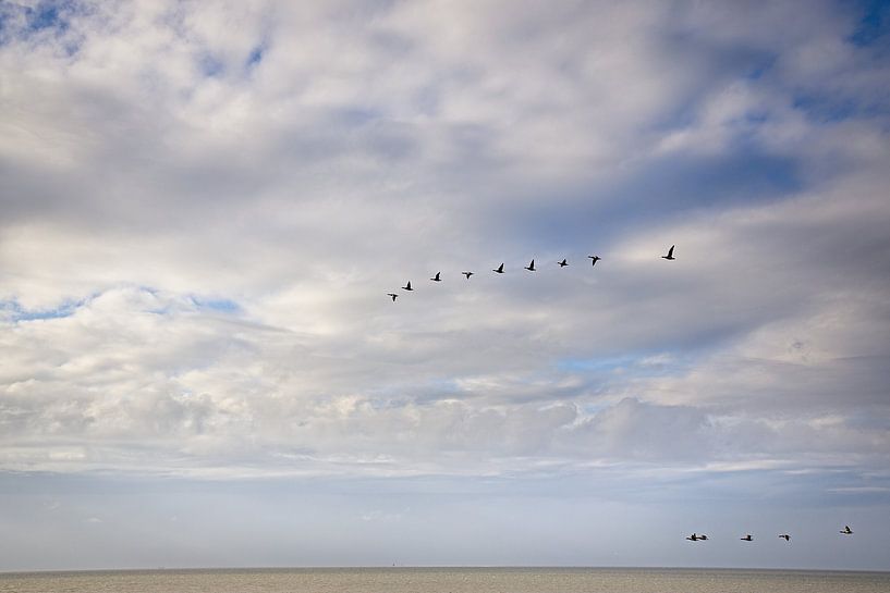 Achetez cette œuvre d'art de paysage Oies en migration au-dessus de la mer des Wadden par Rob Boon sur toile, aluminium, ArtFrame ou photographie (encadrée), impression d'art en haute qualité et tout format.