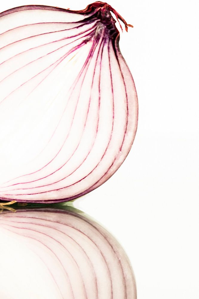 Nature morte de l'oignon rose avec reflet. Photo macro. Photo d'art.