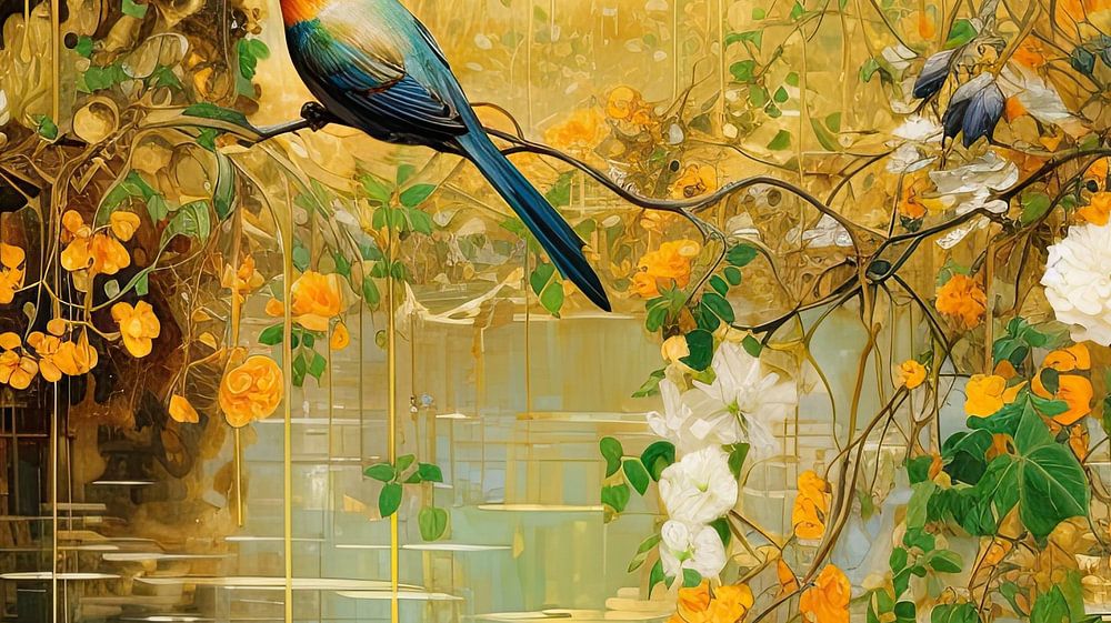 Un oiseau est assis dans un beau paysage parmi des branches et des fleurs. Au-dessous de l'oiseau, un lac se reflète. Style Art-nouveau.