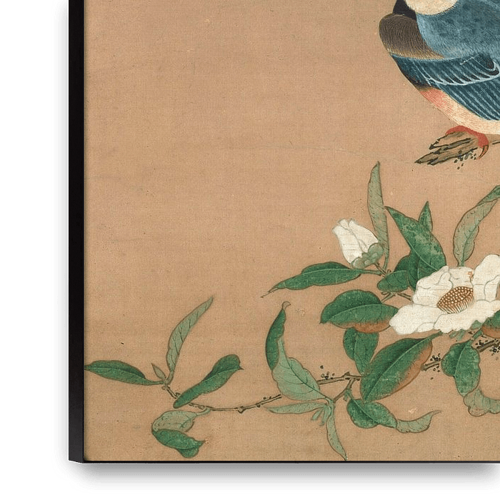 Les artistes de l'école Kano se sont inspirés de peintures chinoises importées pour créer des sujets comme celui-ci. Perché au sommet d'une branche de camélia noueux, un oiseau à longue queue se tourne pour regarder à sa droite. Cet oiseau chanteur domestiqué, une sorte de pie, est appelé "rubans" en chinois, en référence aux plumes de la queue qui ressemblent aux rubans de soie des sceaux ou des médailles officiels en Chine. Contrairement à la branche, qui est rendue à l'encre avec de minuscules points suggérant le lichen, l'oiseau et les fleurs sont peints avec de riches couleurs minérales et une profusion de détails. Les artistes qui travaillaient pour la cour impériale de Chine utilisaient ce style pour imiter les formes de la nature de la manière la plus réaliste possible : ici, on perçoit la forme élancée et dodue de l'oiseau, la forme lisse et incurvée des feuilles et les pétales ondulés et l'étamine rigide et droite des fleurs.