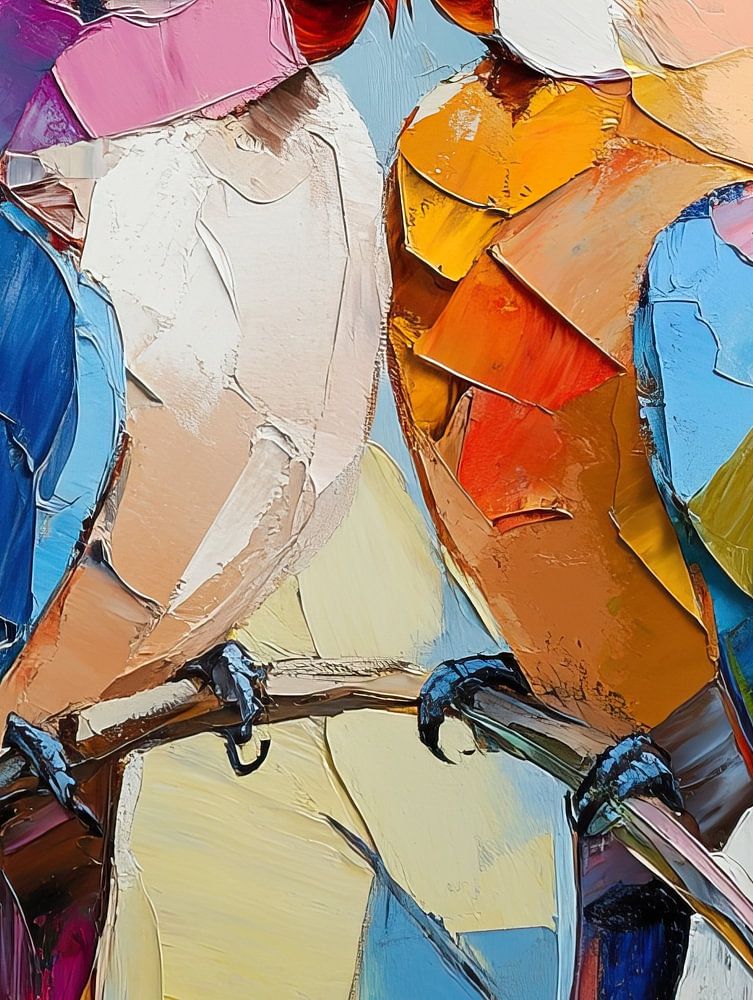 Oiseau rose | Oiseaux rose et jaune sur une branche - Ce tableau représente deux oiseaux colorés, l'un avec une tête rose et l'autre avec une tête jaune, ensemble sur une branche, entourés de couleurs douces et claires qui remplissent l'arrière-plan.