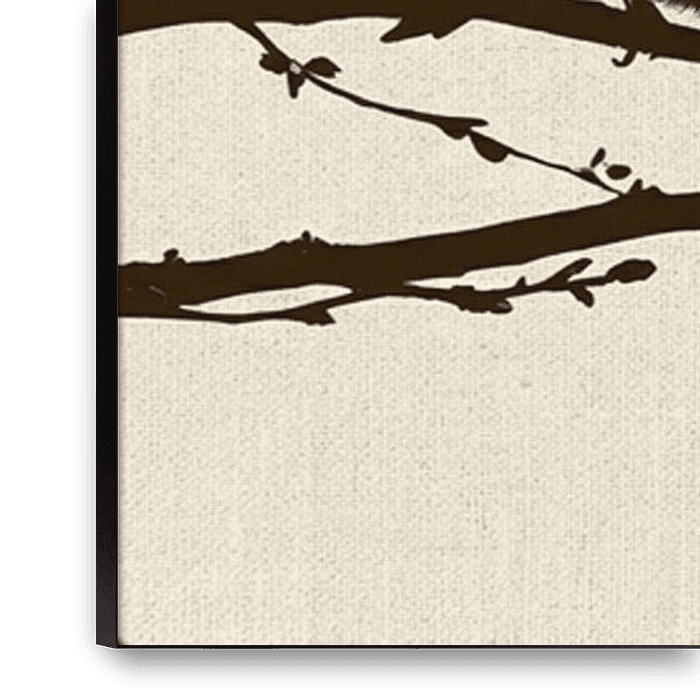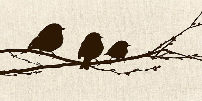Composition en silhouette de trois oiseaux paisiblement assis sur une branche, sur un fond neutre en lin. Les oiseaux sont d'un brun foncé profond, presque noir, et contrastent fortement avec le fond clair. Cela crée une image graphique, presque iconique.