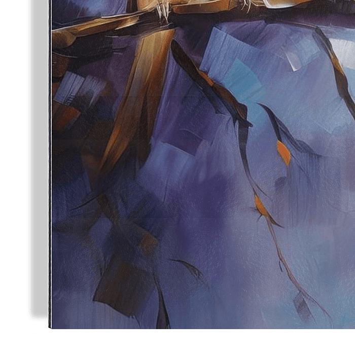 Oiseaux impressionnistes - Cette peinture vibrante montre une rangée d'oiseaux colorés sur une branche, exécutée dans un style impressionniste libre. L'éclat chaud et doré de la lumière tombant sur les oiseaux crée une atmosphère stimulante et se combine magnifiquement avec les tons bleus plus froids de l'arrière-plan, créant un contraste de couleurs dynamique. Les coups de pinceau sont visibles et ajoutent à la texture et au dynamisme de l'œuvre.