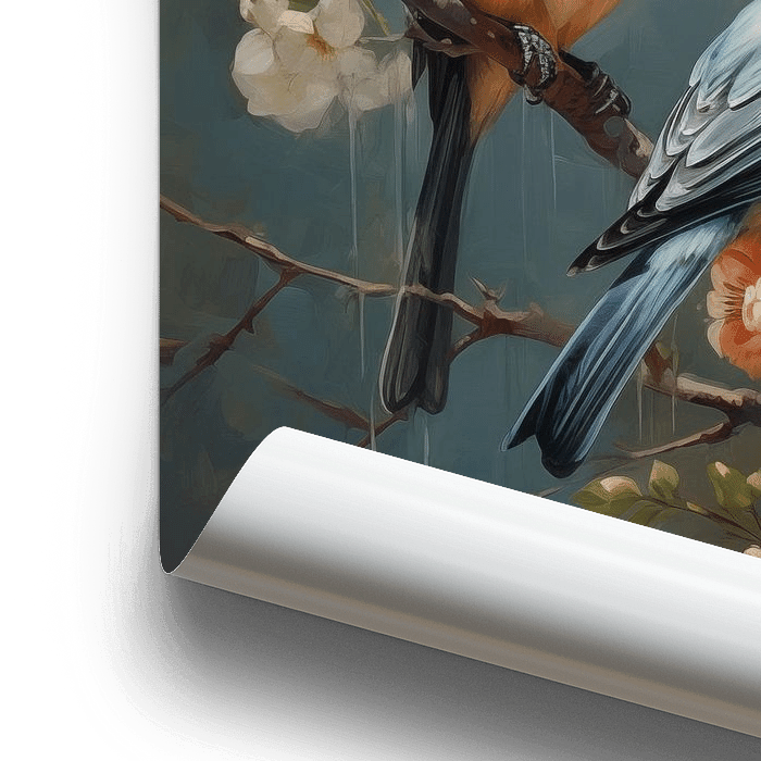 Une peinture unique d'oiseaux sur une branche en couleur claire avec un style magnifique. Avec de belles nuances de couleurs et un design unique, ce tirage photo est élégant et s'intègre parfaitement dans n'importe quelle pièce.