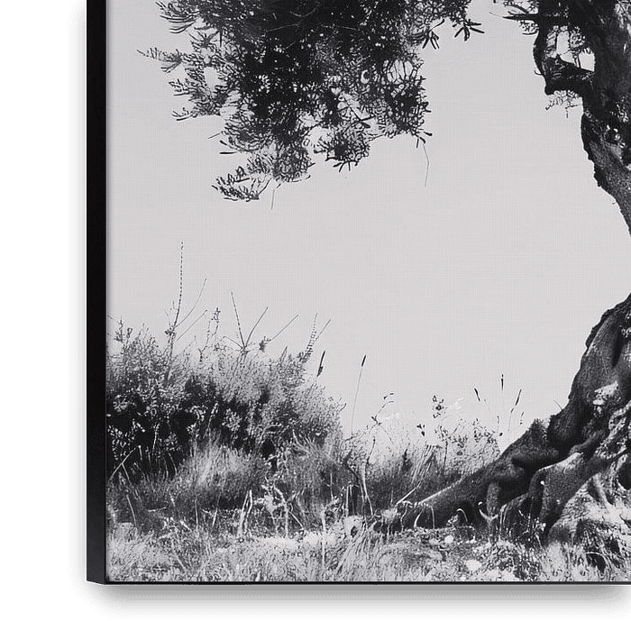 Apportez la sérénité de la nature dans votre chambre à coucher avec cette magnifique photo en noir et blanc d'un olivier. Elle est parfaite pour être placée au-dessus de votre lit ou dans un coin salon.