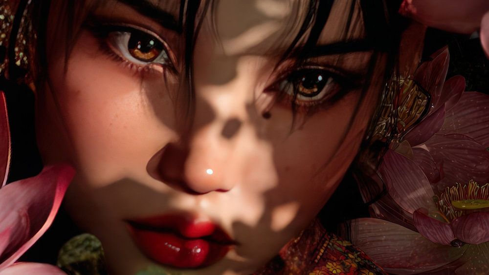 Portrait très détaillé d'une femme dans l'ombre, encadrée de fleurs de lotus d'un rose intense, avec des yeux intenses et des lèvres d'un cramoisi saisissant, d'une beauté profonde et mystérieuse.