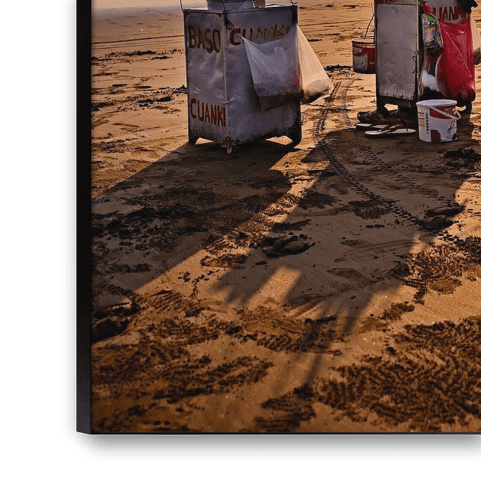 La photographie capture une scène typique et pleine d’authenticité sur la plage de Pangandaran. En premier plan, un vendeur ambulant a installé son stand improvisé, protégé par un grand parasol aux couleurs vives. Dans ses petites glacières et paniers, il propose des spécialités locales aux visiteurs profitant de leur soirée au bord de la mer. L’arrière-plan révèle la silhouette de familles et de groupes d’amis, profitant de la plage et du coucher de soleil. La lumière dorée du crépuscule enveloppe la scène, projetant de longues ombres sur le sable et donnant à l’image une atmosphère chaleureuse et presque nostalgique. Ce cliché illustre parfaitement la rencontre entre la vie quotidienne et la beauté naturelle : un instant simple, mais riche de culture et de convivialité. Le stand ambulant, avec ses inscriptions peintes à la main, rappelle la place essentielle de la cuisine de rue dans la vie indonésienne, même au bord de l’océan. Un témoignage vibrant du charme authentique de Pangandaran.