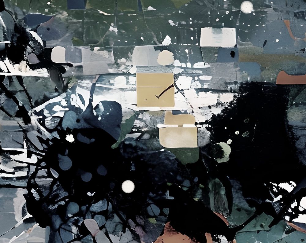 Ombres et lumières se heurtent comme deux univers oubliés qui se rencontrent enfin. Les éclaboussures d'encre noire jaillissent comme si la nuit elle-même s'était fissurée, dispersant ses étoiles dans l'aube fragile.