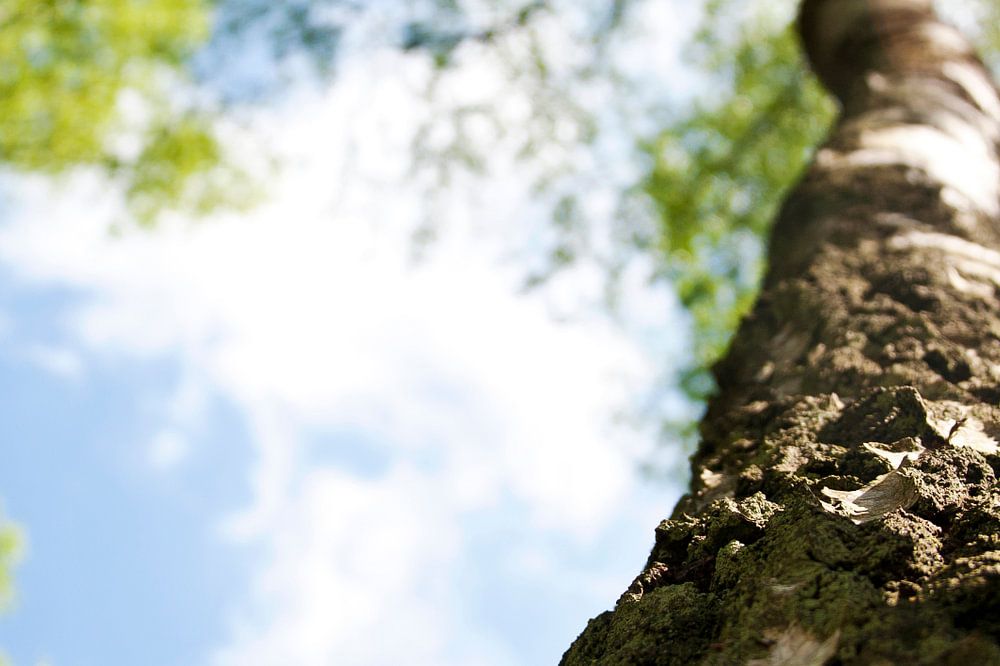 Bijzondere kijkhoek van een boom met groene blaadjes tegen een blauwe lucht.