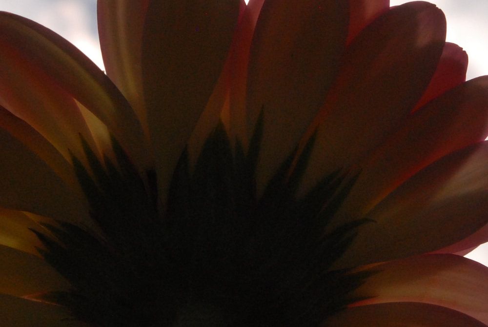 Door middel van macrofotografie de onderkant van deze Gerbera gefotografeerd tegen het zonlicht in. De zon schijnt tussen de wolken door.