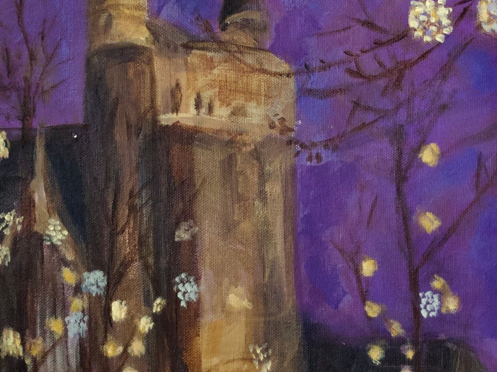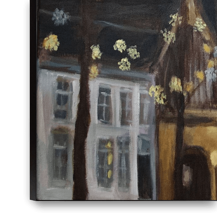 Cette peinture est une représentation atmosphérique de la place Onzelievevrouweplein à Maastricht, avec ses belles lumières caractéristiques dans les arbres à l'époque de Noël. C'est dans ce décor que se déroule le programme "de Kerststal" en 2025. La place est caractérisée par la magnifique Onzelievevrouwenkerk, les cafés accueillants…