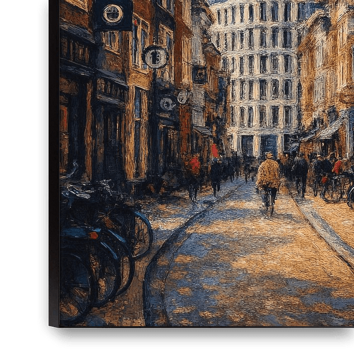 Cette œuvre capture l'âme de la ville : vivante, habitée et pleine d'histoires. On peut presque entendre le doux cliquetis d'une bicyclette sur les pavés, le murmure des gens sur les terrasses et le doux tic-tac de l'horloge au loin.